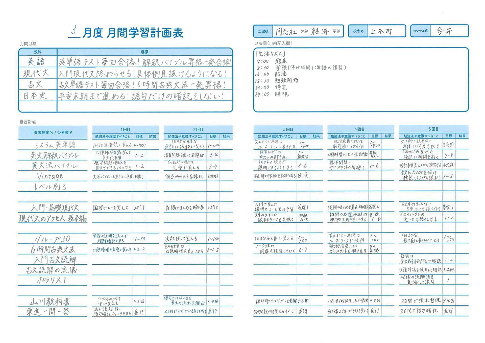 具体的には、自習コンサルティング初回時にマナビゲーションマップという、第一志望合格までに勉強しなければいけない内容がかかれた表を差し上げます。