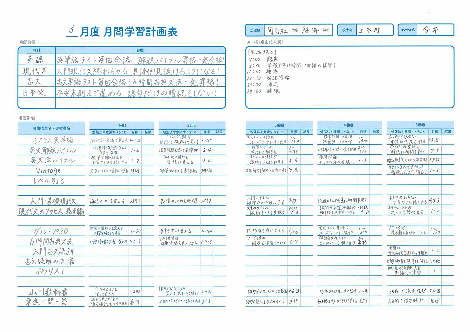 現在の学力と志望校に合わせてひとりひとりに勉強計画を作成します。